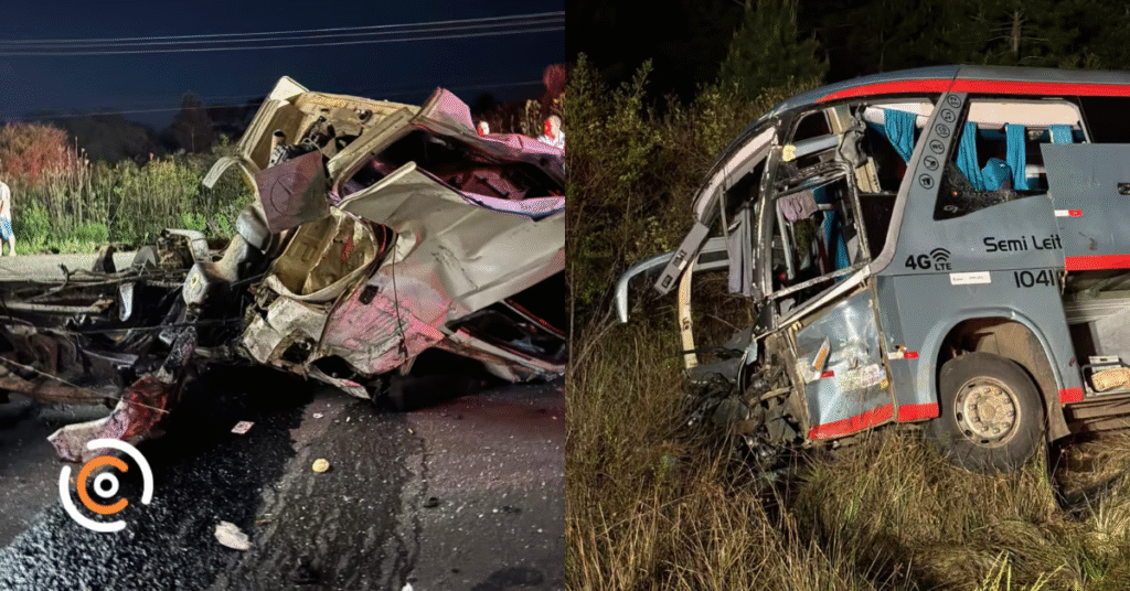 SÃO MATEUS DO SUL, PR – Um grave acidente registrado na noite deste domingo (05), no km 463 da PR-151, em São Mateus do Sul, resultou em duas mortes e 15 pessoas feridas. A colisão frontal envolveu um ônibus, que transportava 33 passageiros e dois motoristas, e um caminhão-baú de pequeno porte. O motorista do caminhão, inicialmente socorrido em estado grave, não resistiu aos ferimentos e morreu no Pronto-Socorro Municipal. No local, outro motorista do ônibus também perdeu a vida, enquanto o condutor que dirigia no momento da batida sofreu escoriações leves.