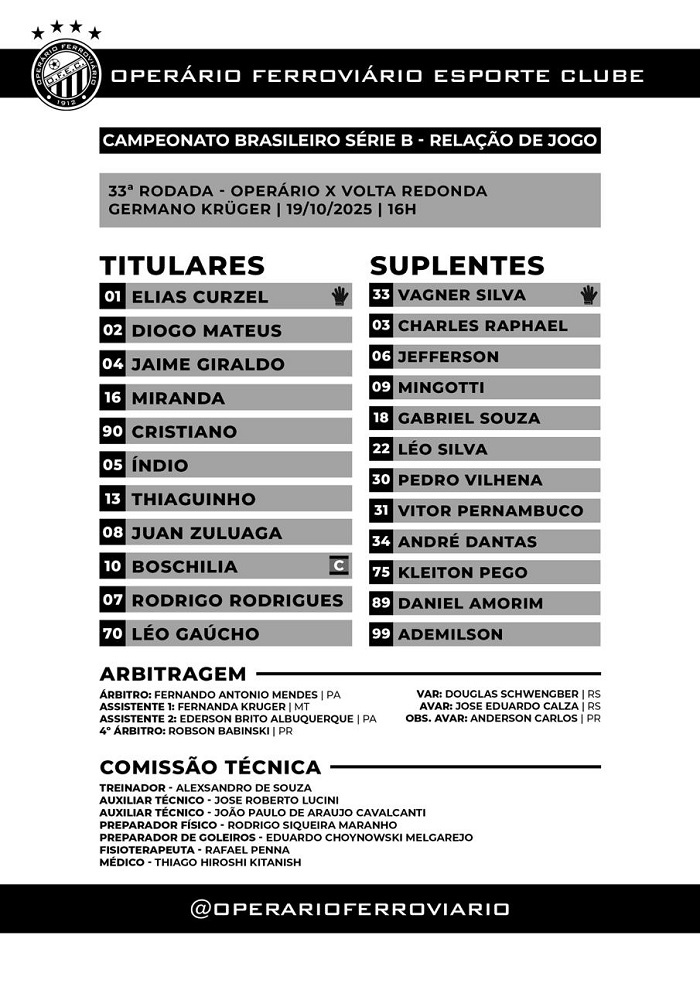 Faltando apenas seis rodadas para o encerramento do Campeonato Brasileiro da Série ‘B’, o Operário Ferroviário enfrenta o Volta Redonda, neste domingo, às 16 horas, no Estádio Germano Kruger. Para se manter na 13ª posição e se aproximar da marca de 45 pontos necessários para assegurar o seu lugar na competição em 2026, o “Fantasma” precisa voltar a vencer.